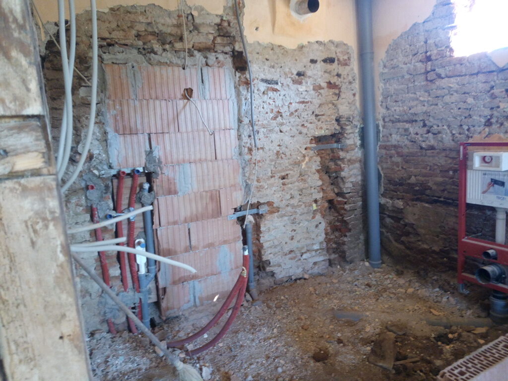 Nachdem umfangreiche Vorarbeiten – Kanalisation und Frischwasserleitungen legen, Dach und Giebelmauer sanieren – erledigt waren, konnte es drinnen mit der Entkernung und Neuinstallation weiter gehen.